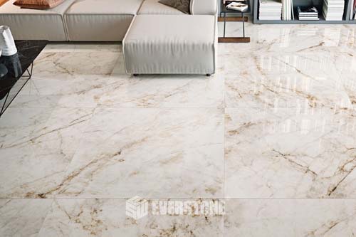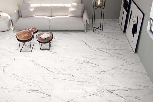Corinto porcelain tile showcases bold marble-style veining with warm natural tones flowing across a luminous white base. The dramatic pattern creates a luxurious architectural finish perfect for statement floors and refined interior designs.