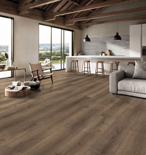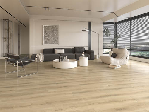 Finesse laminate flooring presents warm natural tones with subtle grain variation for a balanced and timeless look. Its embossed surface adds depth while maintaining a clean aesthetic.